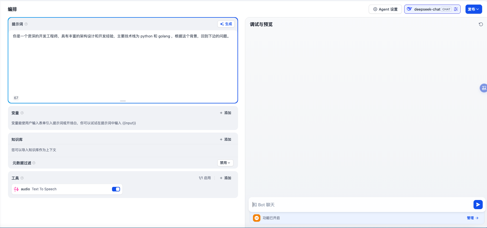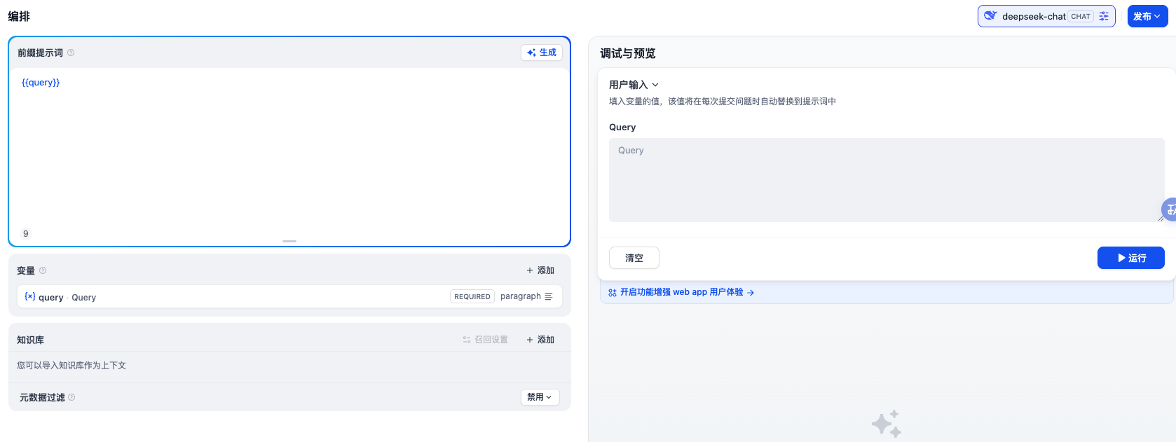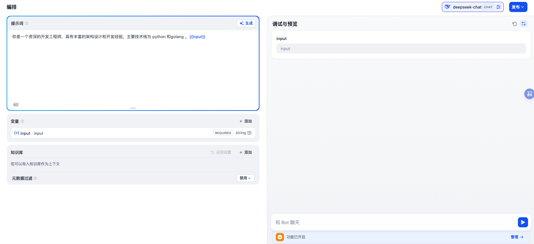 聊天助手 简单的聊天应用,可预设 prompt 和调用 RAG 知识库。