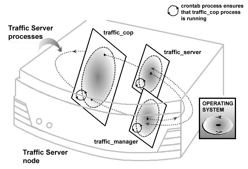 进程监控 traffic_server 和 traffic_manager 进程的健康状况。traffic_cop 进程通过抓取合成 web 页面的心跳请求方式周期性地(每分钟若干次)查询 traffic_server 和 traffic_manager 进程。如果失败事件发生(如果在超时时间间隔内没有收到请求或者收到错误的请求),traffic_cop 重启 traffic_server 和 traffic_manager 进程。