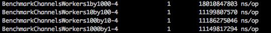 即使线程数量减少,处理时间的变化也在合理的误差范围内。如果还不是很明显,这可能是代码设计方式的问题。虽然我们有许多线程,但他们都在互斥锁排队等候。如果没有互斥锁,这种虚构的工作机制就不安全,我们所做的只是添加了额外的 goroutine