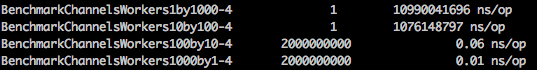 即使有一个读写消费者,性能也优于互斥设计,并且随着更多工作人员的加入,它会快速接近理论最大值(因为我们设计的写入是同步的,最大值将达到10000000000 ns/op)。如果我们改为有一个系统可以按顺序处理“Write”,那么缩放是荒谬的: