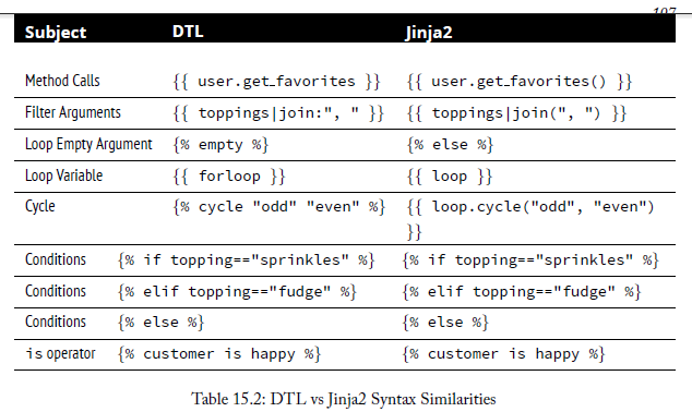 - jinja2 有更少的限制,例如可以给一个filter传递无限个参数。而DTL 只能传一个。
