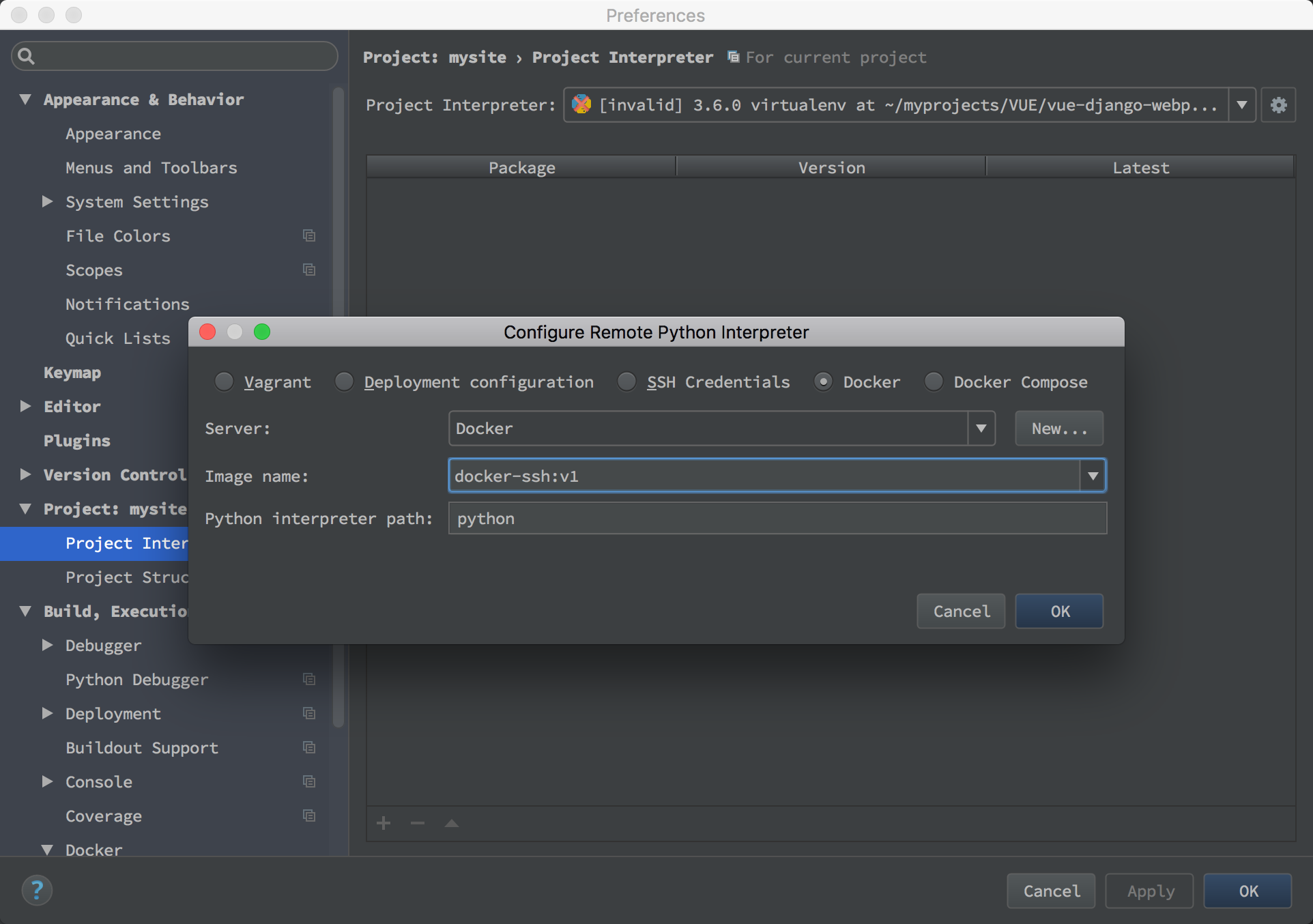 并且配置和Django等服务的配置在一个地方,注意区分,不要把Docker的配置和Django运行的python interpreter