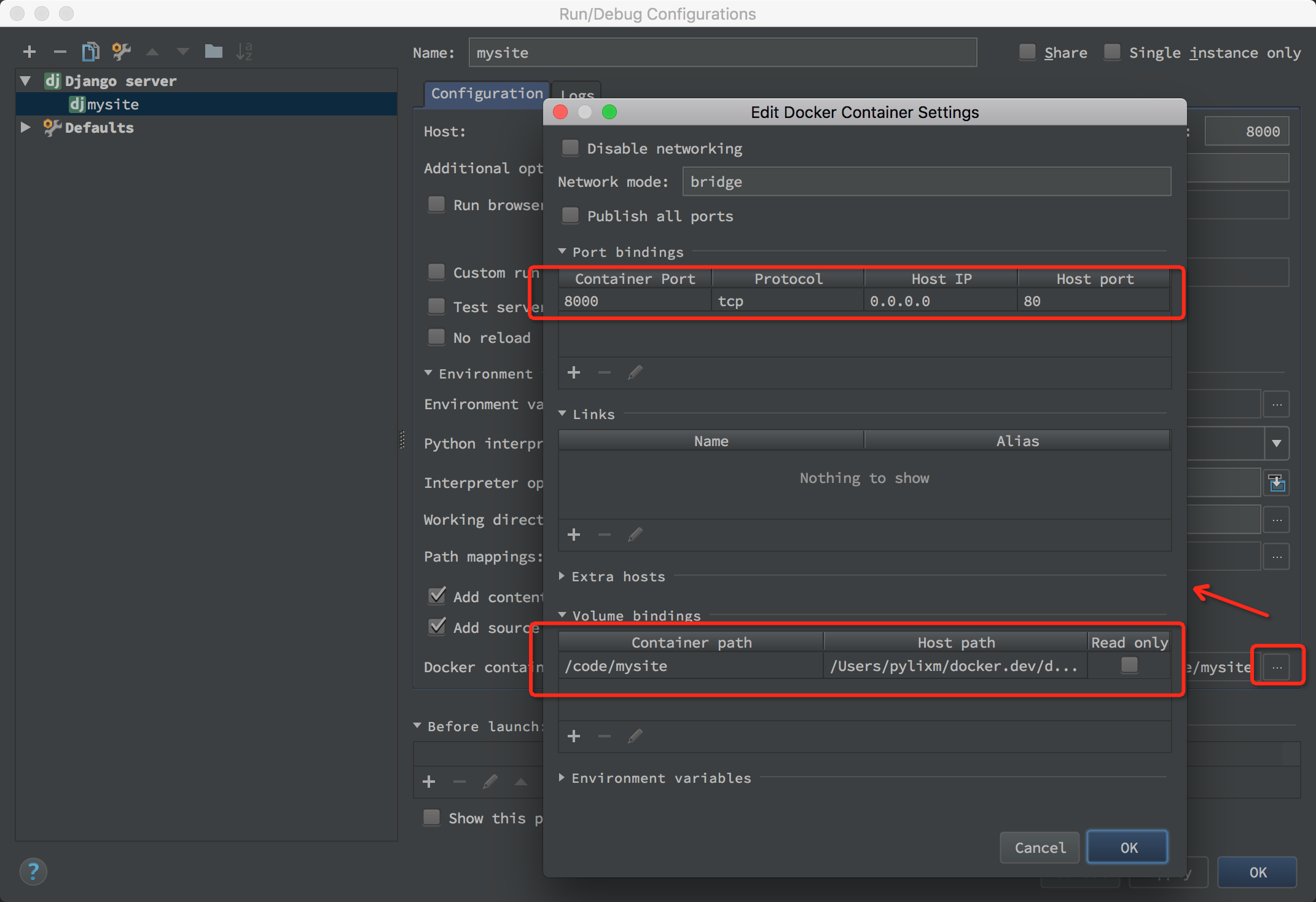 > - 挂载项目目录的数据卷: ` /Users/pylixm/docker.dev/django-demo/mysite:/code/mysite`