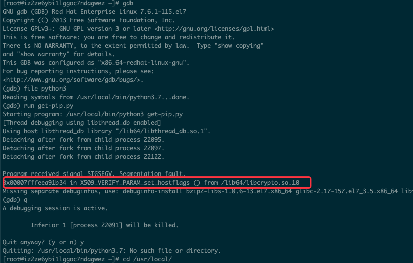 字样,并不会返回具体的错误信息和调用栈。此时我们需要调试工具gdb